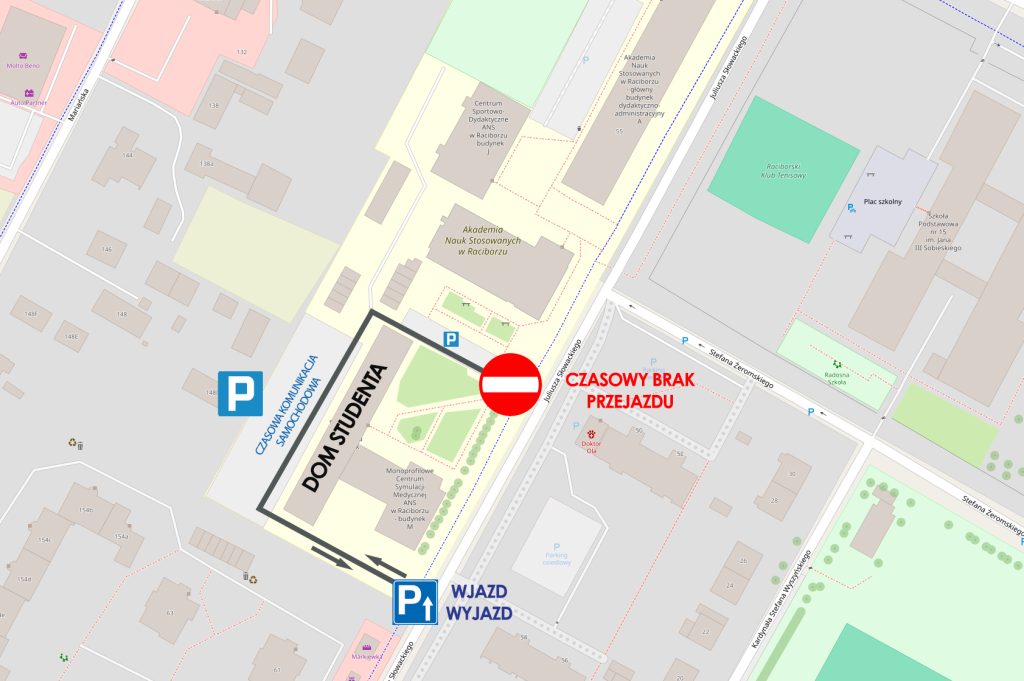 ANS w Raciborzu informuje, że w terminie 17.03.2026 godz. 7.00 – 19.03.2026 godz. 12.00 nastąpi czasowa zmiana organizacji ruchu na terenie przylegającym do Domu Studenta zgodnie z załączoną grafiką. Utrudnienia wystąpią w związku z koniecznością przeprowadzenia prac naprawczych nawierzchni drogi wjazdowej z ul. Słowackiego na teren posesji Domu Studenta.